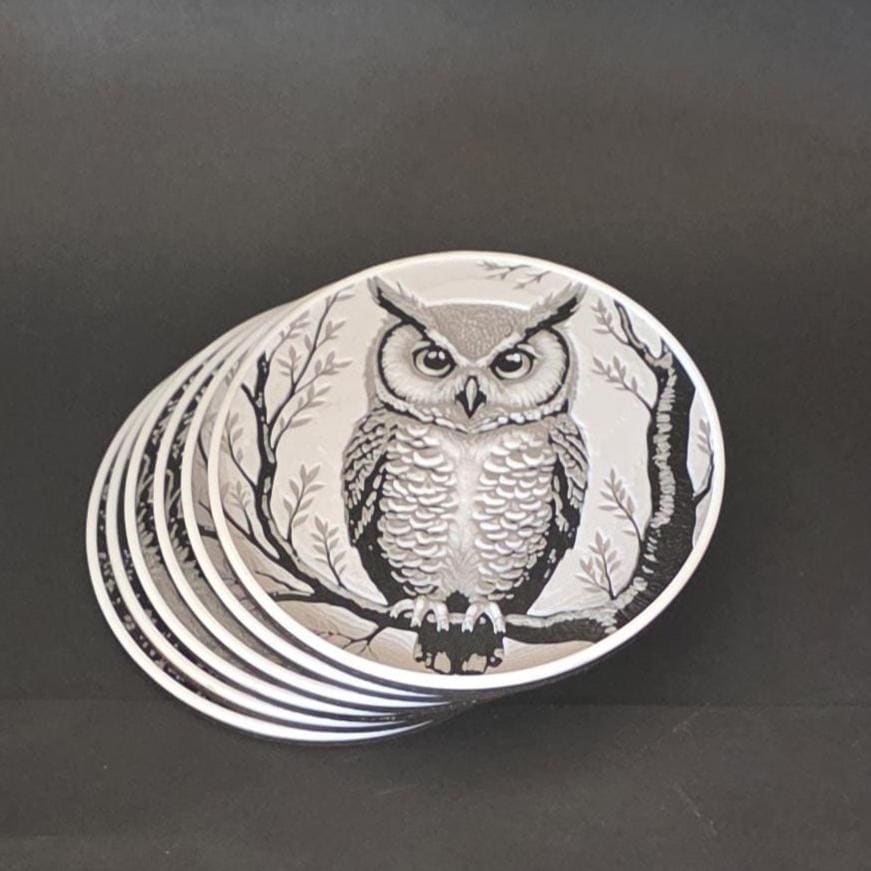 Bring a touch of the wild indoors with this stunning set of sixlaser-etched coasters featuring a majestic stag, a cunning fox, and a wise owl. Crafted with premium 3D printed detail and sealed for durability, each coaster is backed with natural cork to protect your surfaces and add a warm rustic touch to your space.